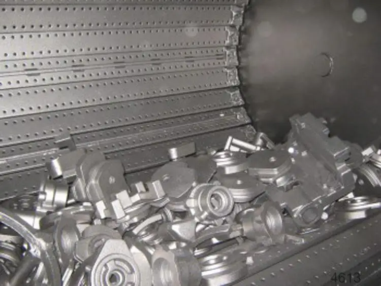 Tumble belt batch machines can also be equipped with a steel belt (manganese steel) instead of a rubber belt. Thus equipped, the machine is suitable for components weighing up to 150 kg (3000 kg batch weight).